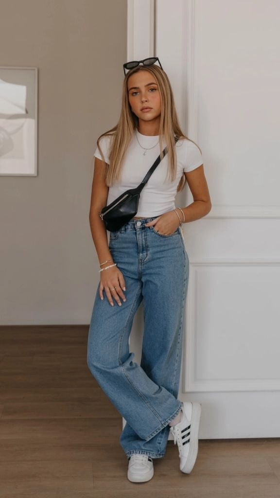 Sometimes the simplest combination is the one that turns the most heads. A fitted white baby tee tucked loosely into high-waisted wide-leg jeans — that’s it. That’s the whole outfit. And yet this trendy teen summer outfit manages to look like it belongs on a mood board. The proportions here are everything. The cropped tee highlights the waistline while the wide-leg denim creates that long, flowing silhouette that’s been dominating teen aesthetic outfit ideas all year. Add a belt bag slung across the chest and sunglasses pushed up on the head, and you’ve got pure Pinterest energy.