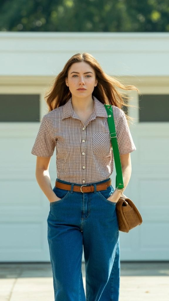 For the shirt, Madewell and J.Crew have excellent gingham options that are lightweight enough for real heat. The belt is key here — it defines the waist and ties in with the warm brown tones of the bag. For jeans, Levi’s Ribcage Wide Leg or their classic 501s in a medium vintage wash would be perfect. Keep the fit slightly relaxed through the leg for that authentic retro proportion.