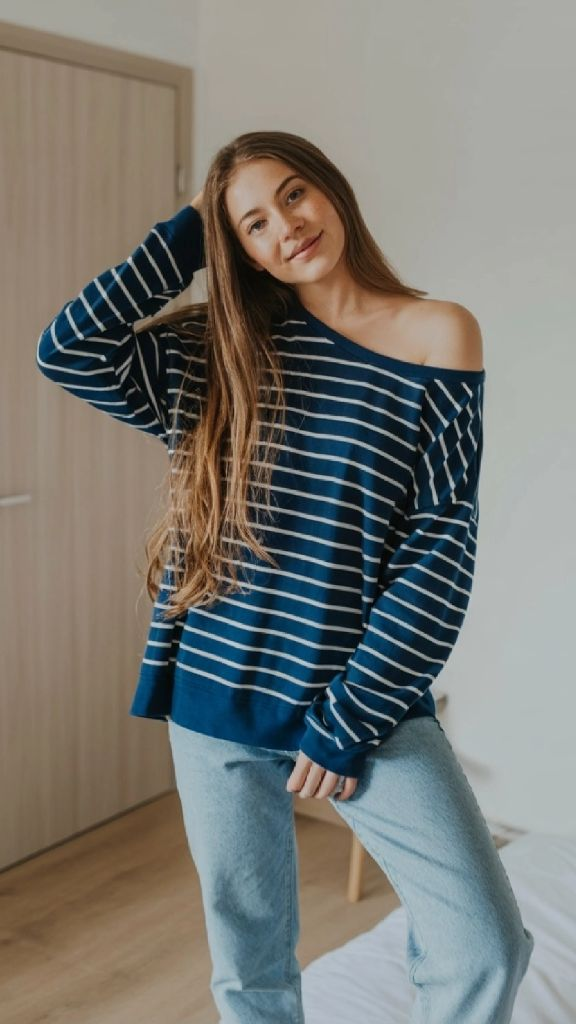 Summer isn’t all blazing sunshine and tank tops — there are those cool evenings where you need a layer, and this navy-and-white striped oversized sweater is the answer. Paired with light wash jeans, it’s the kind of casual summer outfit for teenage girls that bridges the gap between cozy and cute. The off-shoulder drape of the sweater adds a touch of effortless romance, and the Breton stripe pattern has been a staple of summer style for literally decades. It feels like a warm hug that also happens to look amazing.
