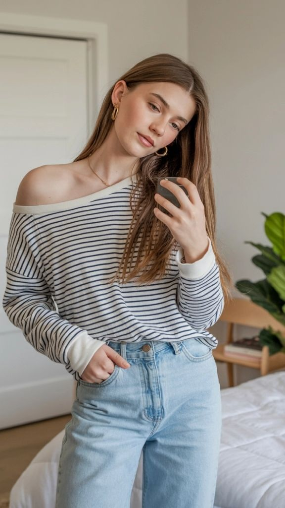There’s something about a boatneck striped top that immediately makes everything feel more polished. This look features a white sweater with thin blue stripes, slightly off the shoulder, paired with light wash jeans. Gold hoop earrings and a delicate necklace add warmth to the cool blue-and-white palette. It’s elegant without being fussy, comfortable without being sloppy. This is one of those teen summer fashion ideas 2026 that you could wear to a seaside lunch or a casual family dinner and feel perfectly appropriate either way.