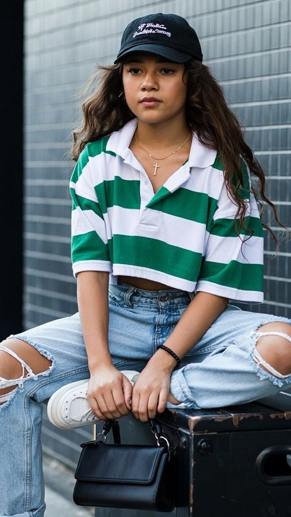 The cropped rugby polo is having a serious moment, and this green-and-white striped version is proof of why. Paired with light wash distressed baggy jeans, a black baseball cap, and white sneakers, this outfit is pure trendy teen street style energy. The cross necklace and small black handbag add intentional details that make it feel curated rather than random. It’s sporty, it’s cool, and it’s the kind of look that makes you want to explore the city with your friends.