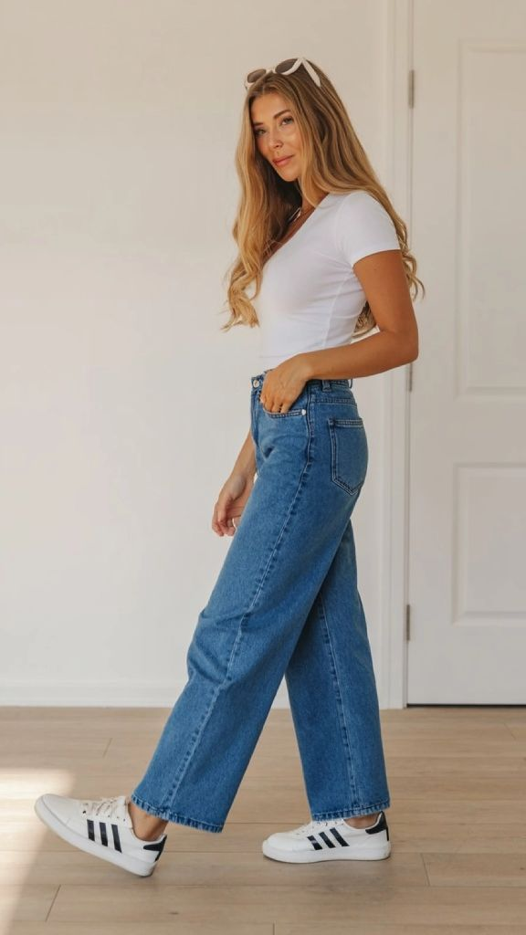 The sneakers are key. Adidas Superstars or Sambas in a classic white-with-black-stripes colorway ground this outfit with a retro-sporty vibe. For the tee, keep it fitted but not tight — Everlane’s Organic Cotton Crew or Uniqlo’s U collection both hit this mark perfectly. The jeans should sit at the natural waist, and the hem should just graze the top of the shoe. That length is the sweet spot for wide-legs.