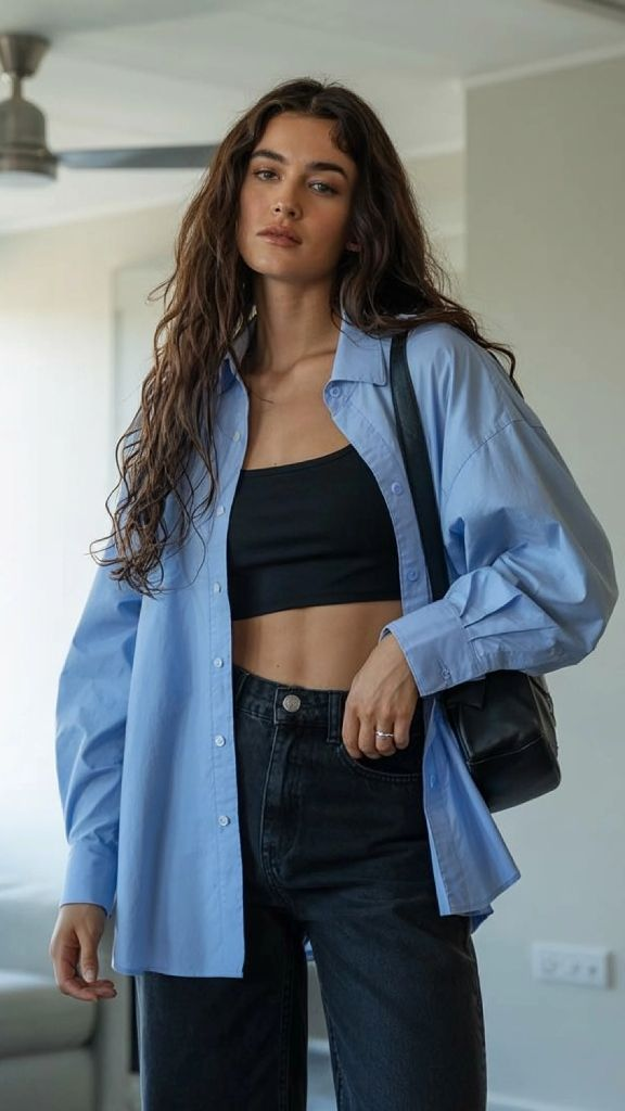 Oversized Blue Button-Down With Black Basics