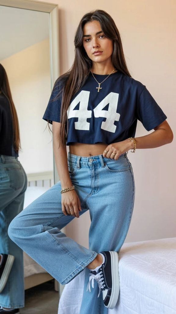 The cropped athletic jersey is one of the strongest trends in teen summer fashion ideas 2026, and this outfit shows exactly why. A navy cropped tee with a bold white “44” paired with light wide-leg jeans and dark sneakers has that perfect balance of sporty and stylish. The cross necklace and gold bracelet add feminine details against the athletic fabric, and the relaxed posture — leaning against a mirror — gives the whole look a candid, effortless quality.