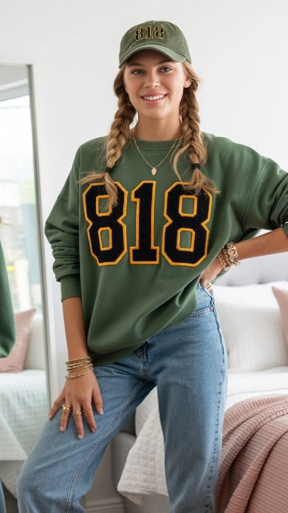 The sweatshirt has that perfect lived-in quality — slightly oversized, slightly faded green, with the kind of textured lettering that makes you want to touch it. Brands like Princess Polly and White Fox Boutique carry similar graphic sweatshirts in bold fonts. The matching cap takes it from “I just grabbed a hoodie” to “I planned this.” For the jeans, keep them relaxed and slightly cropped at the ankle so the sweatshirt is the focus.
