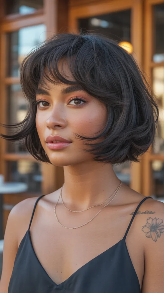 Sometimes the most powerful color statement is no color at all — just the deepest, most saturated black you can achieve, worn in a cut that does all the talking. This tousled French bob with soft bangs is pure Parisian spring energy. The texture is choppy and lived-in, the kind of cut that looks better on day two than day one. Against dark skin, jet black hair creates this incredible contrast that highlights bone structure, the brightness of eyes, and the natural glow of the complexion.