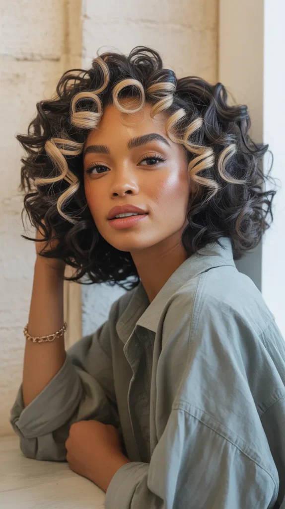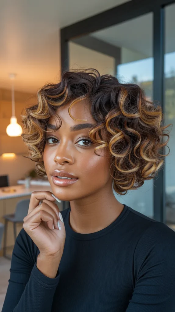 A short curly bob with golden honey highlights threaded through dark spirals — this is the kind of look that radiates joy. The curls are tight and bouncy, full of personality and movement, and those honey-blonde pieces catch the light like tiny sunbeams woven through the hair. It’s playful, it’s youthful, and against dark skin, those warm golden tones create a gorgeous frame around the face that draws attention to the eyes and cheekbones.