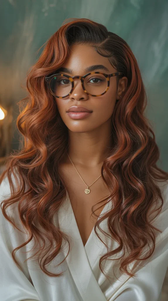 Here’s a look that proves hair color doesn’t exist in a vacuum — it interacts with everything, including your accessories. These long, rich auburn waves paired with tortoiseshell glasses create a cohesive warm palette that’s intellectual, stylish, and deeply flattering on dark skin. The auburn shade leans more red than brown, with enough depth to avoid looking washed out, and the waves have a polished, editorial quality. It’s one of those hair color ideas for dark skin women that feels complete and intentional.