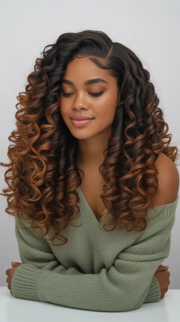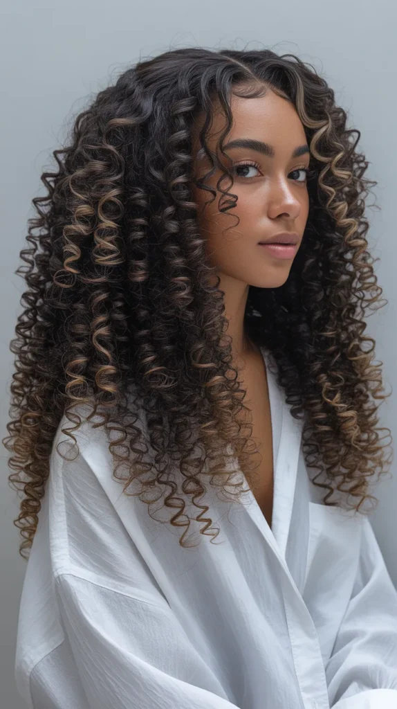 There is something mesmerizing about long, perfectly defined spiral curls that gradually lighten from deep black at the roots to warm golden-brown at the tips. This look is all about celebrating natural curl texture while adding just enough color to make it feel like spring. The spirals have incredible definition — each one distinct, each one catching the light differently — and the golden tips add this beautiful sense of depth and dimension.