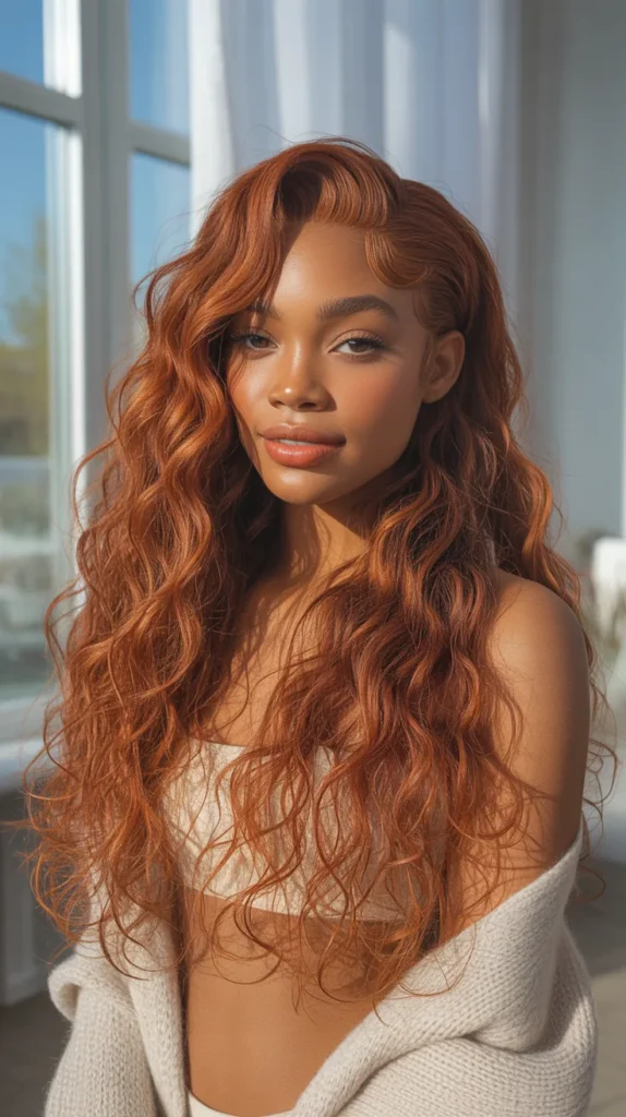 Full, flowing ginger waves with that gorgeous natural texture — this is autumn meeting spring in the most spectacular way. The color is a true ginger — warm, red-orange, and absolutely alive — and the waves have a natural, beachy quality that looks effortless and free. On dark skin, ginger creates this unexpected and beautiful contrast that is turning heads everywhere in 2026. This is the kind of spring hair color trend 2026 dark skin enthusiasts are gravitating toward because it’s daring, warm, and endlessly photogenic.