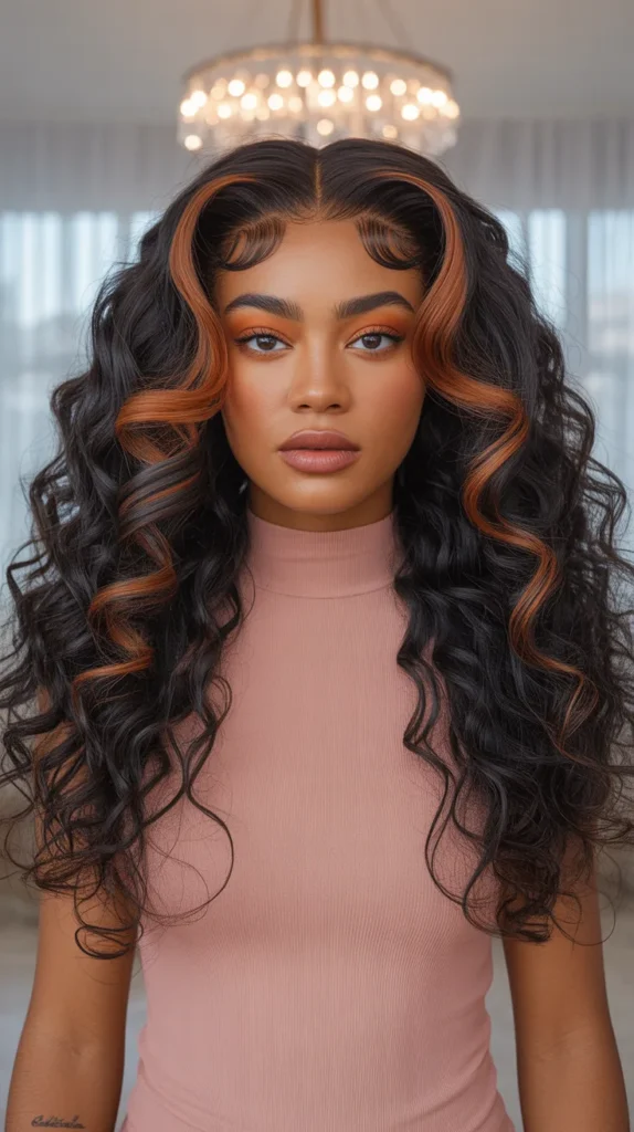 Long, voluminous curls in deep black with copper face-framing pieces that sweep and curl around the cheekbones — this is drama done right. The dark base is glossy and rich, and the copper accents are placed with intention, framing the face like a warm spotlight. The curls have a vintage Hollywood quality to them, with that center part adding symmetry and balance. For spring highlights for dark skin, copper face-framing is one of the most flattering techniques because it puts the warmth exactly where it brightens the complexion most.