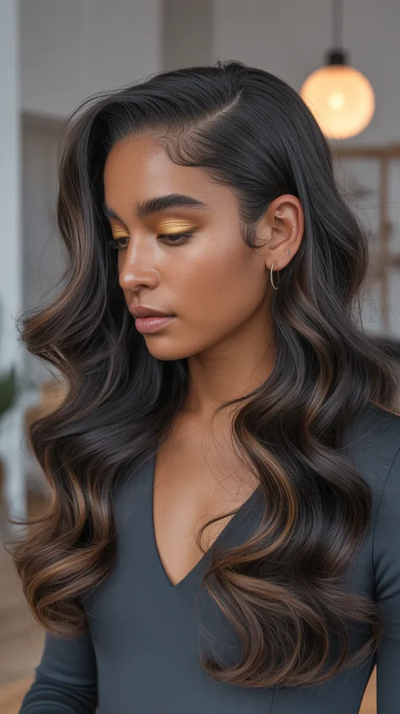 Long, flowing waves in a dark base with rose-copper dimension woven throughout — this is one of those colors that’s hard to define because it shifts and changes with every movement. In some light, it reads as a warm brunette. In others, those rose and copper tones emerge, giving the hair this multidimensional quality that feels alive. It’s the kind of trendy spring hair color for dark skin 2026 that feels both classic and completely of the moment.