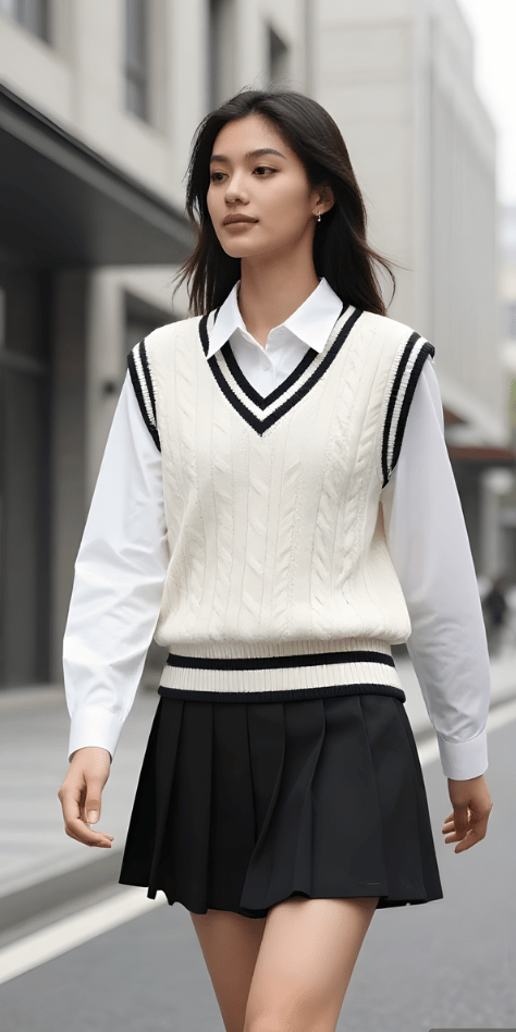 The cricket-style sweater vest with V-neck and contrasting trim creates instant academic energy, and when worn over a crisp white button-down with a black pleated skirt, the result is thoroughly preppy perfection. This outfit demonstrates how spring outfits black tennis skirt styling can lean intellectual rather than purely athletic. The cable knit texture adds visual interest while the black-and-white palette maintains sophisticated restraint.