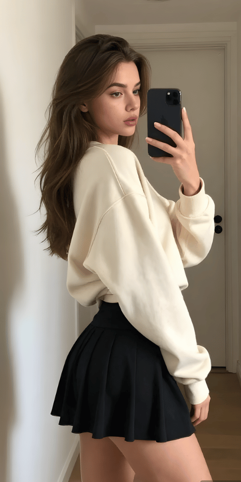 The pairing of an oversized cream sweatshirt with a navy pleated mini skirt creates one of those outfits that looks effortless but feels incredibly chic. This combination plays with proportions in a way that flatters virtually every body type—the volume on top balanced by the shorter, structured bottom. The mirror selfie setting adds authenticity and relatability, showing exactly how this looks in real life rather than on a professional photoshoot set. For those seeking tennis skirt outfits spring options that work for lounging as much as going out, this delivers.