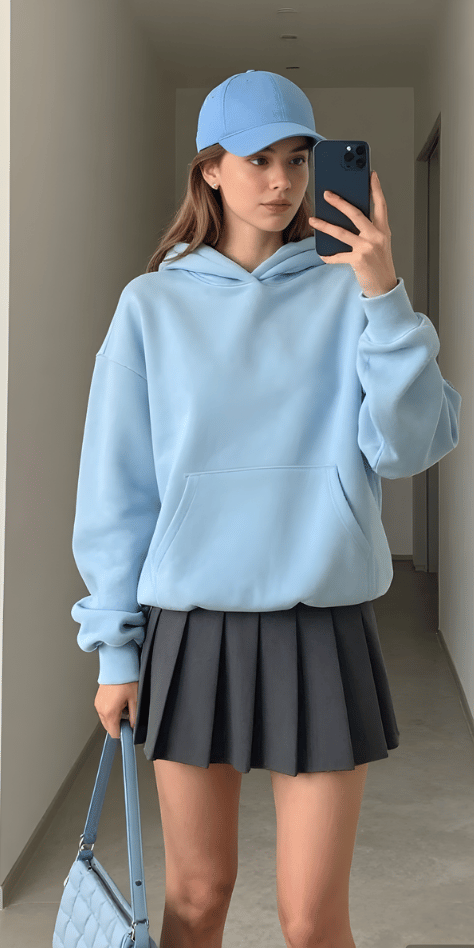 Color blocking with pastels and neutrals creates some of spring’s most visually interesting combinations, and this powder blue hoodie with charcoal pleated skirt exemplifies that beautifully. The oversized hoodie brings cozy energy while the deeper charcoal skirt grounds the look in sophistication. The matching blue cap and coordinated handbag demonstrate how thoughtful accessorizing elevates even casual pieces. This is sporty-chic spring outfits 2026 with a cooler, more unexpected palette.