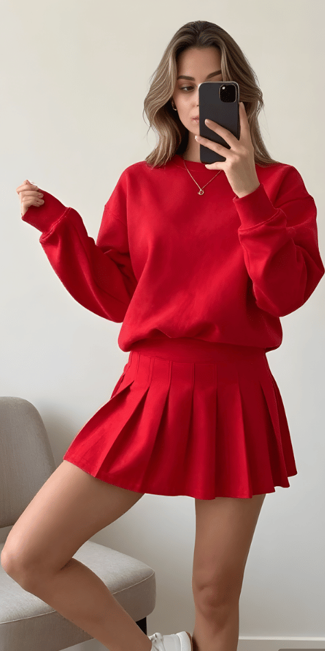There’s something undeniably confident about wearing head-to-toe color, and this red sweatshirt with matching red pleated skirt proves that tennis skirt styling can be a full statement moment. The monochromatic approach eliminates any color-matching anxiety while creating maximum visual impact. The simple gold necklace adds just enough shine to break up the red without distracting from the boldness of the palette. For those seeking cute tennis skirt spring outfits 2026 that make an impression, this direction delivers.
