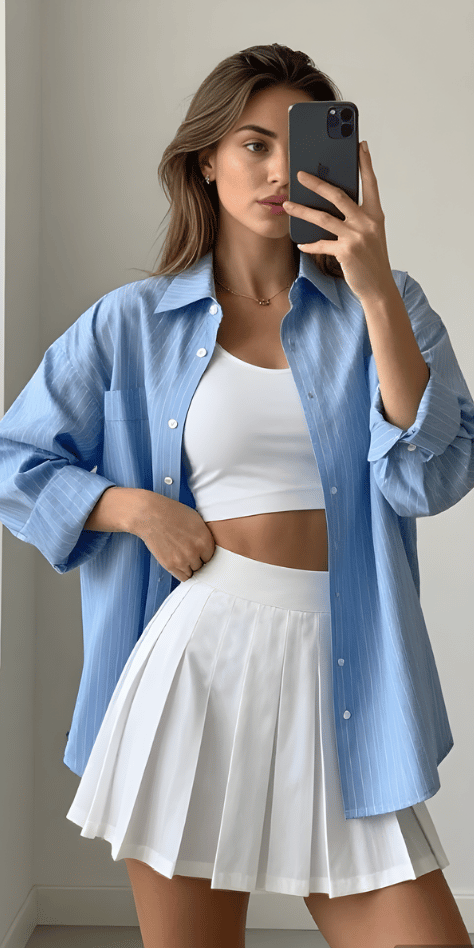 Layering is key for unpredictable spring weather, and this outfit demonstrates the technique beautifully. An oversized striped button-down shirt in soft blue and white covers a white crop top, both paired with a white pleated skirt for maximum fresh energy. The open button-down adds dimension and movement while the stripes introduce pattern without overwhelming. This combination of textures and layers creates one of the more sophisticated spring outfits with white tennis skirt that I’ve seen this season.