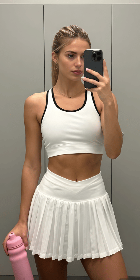 The crop top and tennis skirt combination stripped to its most minimal expression creates something surprisingly elegant. This all-white look features a sports-bra-style crop top with contrasting black trim, paired with a white pleated skirt for a gym-ready aesthetic that works far beyond workout spaces. The high ponytail and clean makeup reinforce the athletic vibe while the setting—clearly post-workout—grounds the outfit in real-life context. This is sporty-chic spring outfits 2026 at its most pared-back and effective.