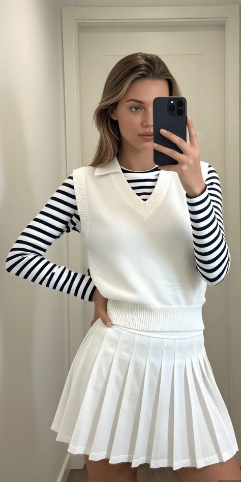 The sweater vest has returned with full force, and layering one over a striped long-sleeve tee creates a perfectly preppy foundation for a white pleated skirt. This outfit demonstrates how tennis skirt outfits spring can incorporate traditional pieces in fresh ways. The navy and white color story runs throughout—stripes on the tee, piping on the vest, pleats on the skirt—creating cohesion without monotony. The collar poking out adds that third layer of visual interest that makes the look feel complete.