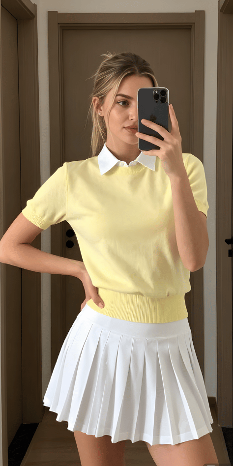 Yellow often intimidates people, but this pale butter shade proves it’s one of spring’s most wearable tones. The short-sleeve polo sweater in soft yellow provides cheerful energy while the white pleated skirt and popped white collar keep the look grounded and sporty. The overall effect is fresh and optimistic—exactly what spring outfits with white tennis skirt combinations should evoke. This palette captures sunshine without overwhelming.