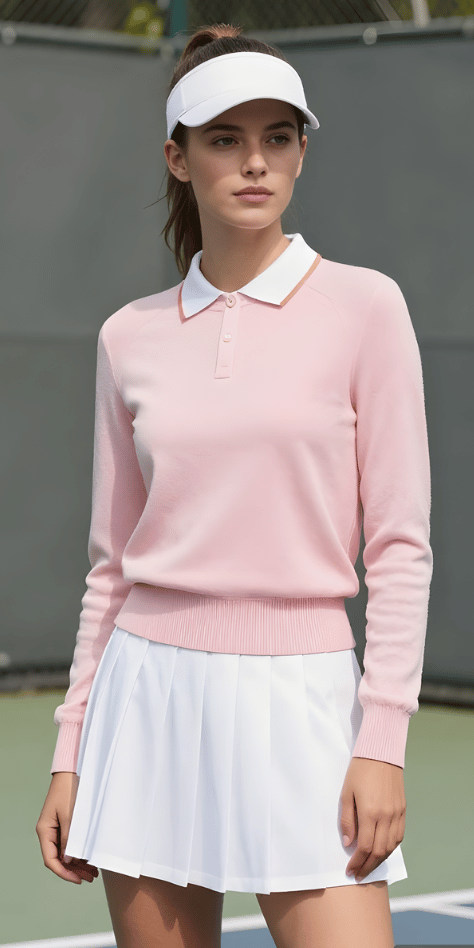 There’s a romantic quality to pale pink that feels perfectly suited to spring, and this long-sleeve polo in the softest blush shade captures that energy beautifully. Paired with a white pleated skirt and a classic white visor, this outfit could genuinely work on an actual tennis court while looking stylish enough for lunch afterward. The white collar adds structure and preppy polish, while the overall palette reads feminine without being overly sweet. This is spring outfits with white tennis skirt styling for those who want their sportswear to feel soft and approachable.