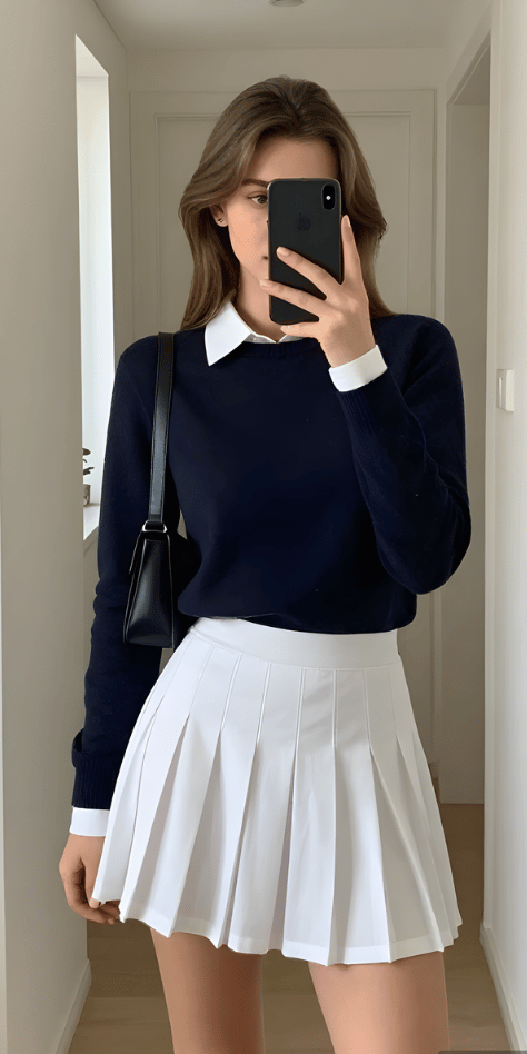 The layered collar detail elevates any simple sweater, and this navy crewneck worn over a white collared shirt demonstrates that principle perfectly when paired with a white pleated skirt. The shoulder bag adds a practical element while reinforcing the sophisticated, going-places energy of the outfit. This combination creates one of the more polished cute tennis skirt spring outfits 2026—appropriate for casual workplaces, nice brunches, or anywhere requiring elevated everyday style.