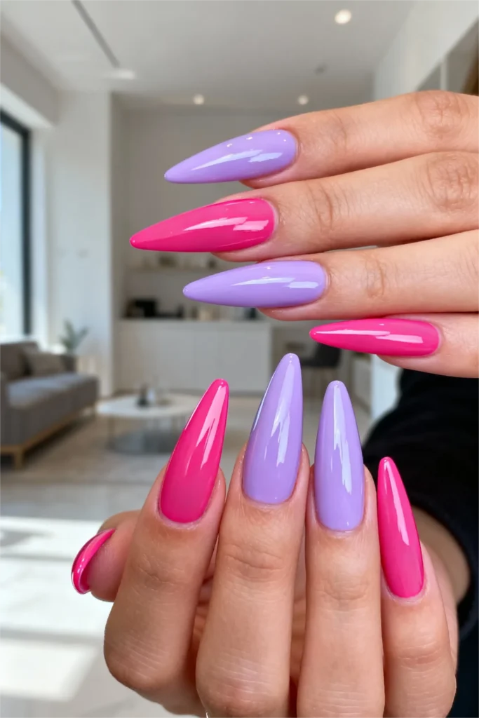 Purple acrylic nails 2026 paired with hot pink creates a youthful, energetic vibe that’s perfect for spring and summer months. The glossy finish on both colors ensures they complement rather than compete with each other, creating visual harmony despite the bold color choices. This design is ideal for those who can’t decide on just one color and want their nails to reflect their multifaceted personality.
