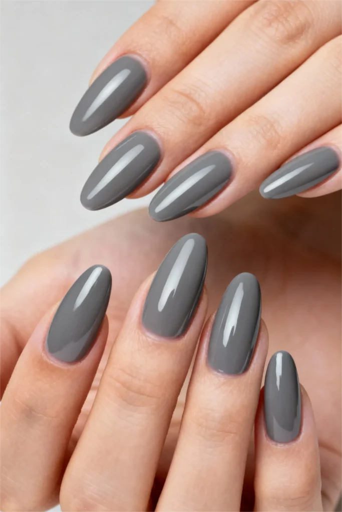 Embrace the power of neutral sophistication with these stunning charcoal gray almond acrylic nails. The deep, smoky gray shade offers a modern alternative to black while maintaining that same level of chic sophistication. The glossy finish adds dimension to what could otherwise be a flat color, creating depth and visual interest through light reflection alone.