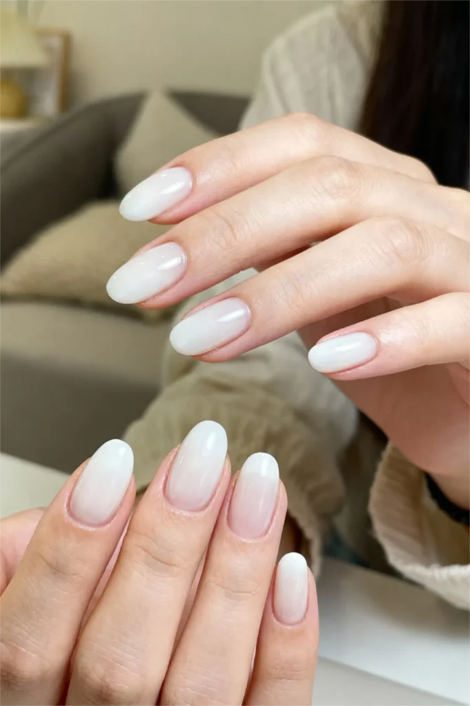 Ethereal beauty defines these soft white ombre acrylic nails that create a dreamy, cloud-like effect. The gradient transitions from a barely-there pink at the base to pure white at the tips, creating an elongating effect that’s both subtle and stunning. The almond shape enhances the gradient effect, providing the perfect canvas for showcasing the gentle color transition.