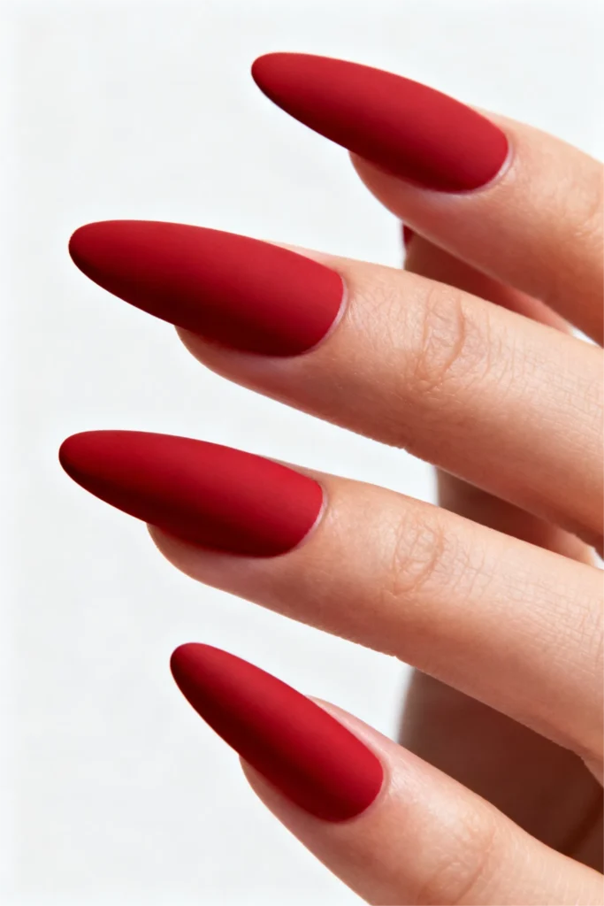 Sophistication takes a modern turn with these stunning matte red acrylic nails. The velvety, non-reflective finish creates a completely different aesthetic compared to glossy reds, offering a contemporary, fashion-forward take on the classic red manicure. The almond shape elongates the fingers beautifully while the matte finish adds an unexpected texture that’s both subtle and striking.