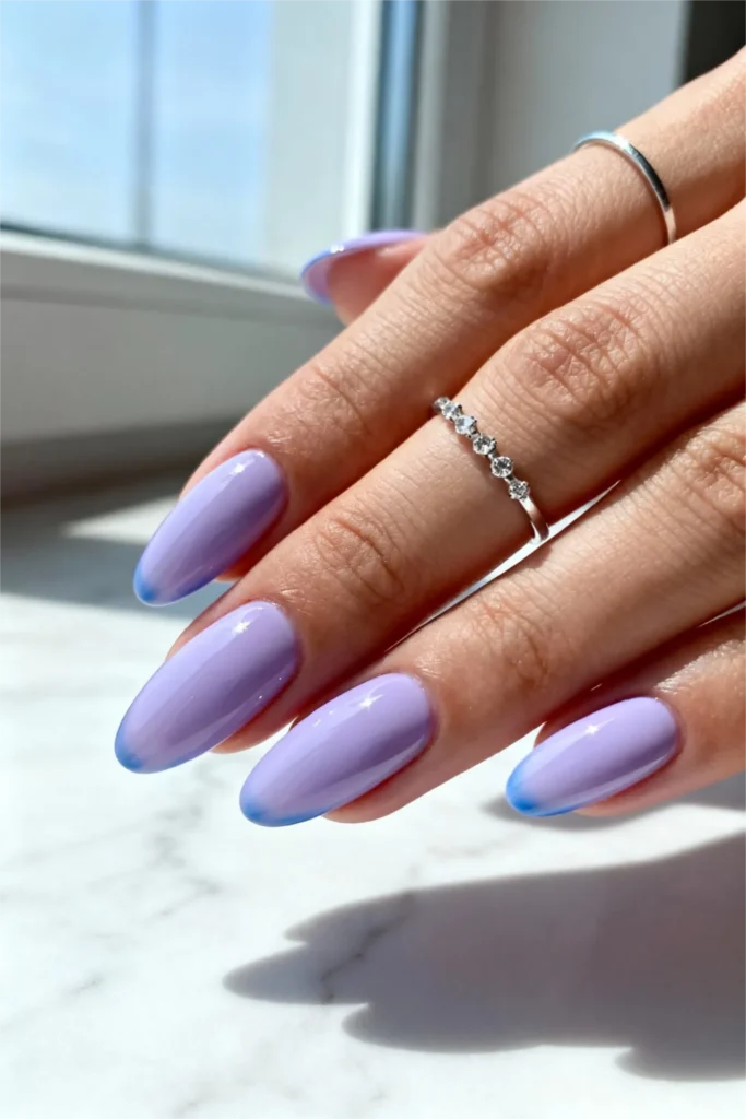 Romance meets modernity with these dreamy lavender ombre French acrylic nails. The design features a gradient transition from a soft, barely-there base to a more saturated lavender at the tips, creating a contemporary take on the French manicure. The almond shape provides the perfect canvas for showcasing the gradual color shift, while the medium length makes the design both impactful and wearable.