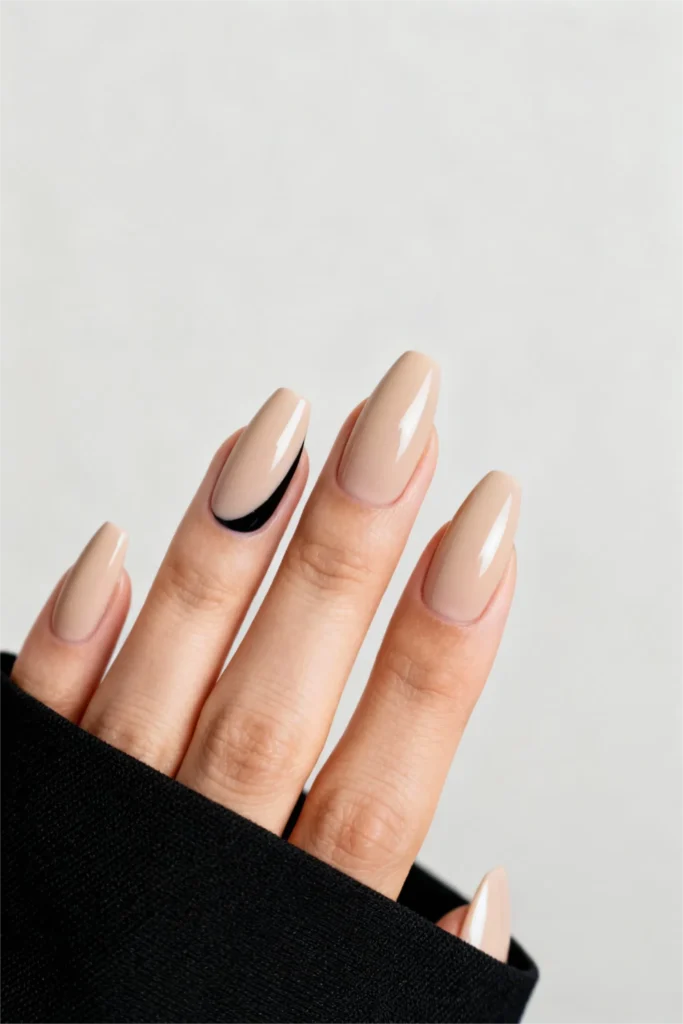 The black accent is perfectly placed and executed, creating a focal point that draws the eye without overwhelming the overall aesthetic. This design is ideal for those who appreciate subtle artistry and want their nails to complement rather than compete with their personal style. It’s office-appropriate yet interesting enough for social settings, making it one of the most versatile short acrylic nails 2026 designs available. The contrast between nude and black creates visual drama through simplicity.