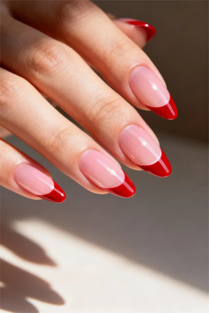 The French tip gets a bold makeover with this stunning red and nude combination that feels fresh and modern for 2026. This design takes the classic French manicure and infuses it with drama through the use of a rich red tip against a soft, natural pink base. The almond shape provides the perfect canvas for this two-tone design, creating a gradient effect that’s both eye-catching and sophisticated.