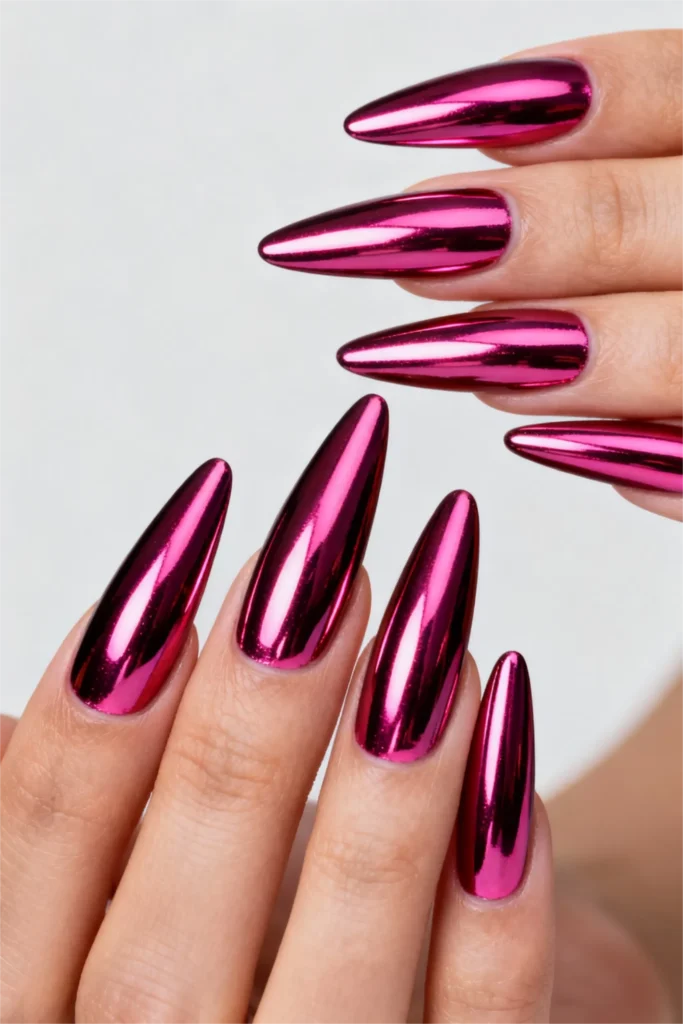 Make an unforgettable statement with these hot pink metallic chrome acrylic nails that demand attention. The stiletto shape takes drama to the next level, creating an ultra-feminine and fierce look that’s perfect for those who love to stand out. The metallic acrylic nails finish creates a mirror-like effect that shifts and shimmers with every movement, making these nails absolutely mesmerizing to look at.