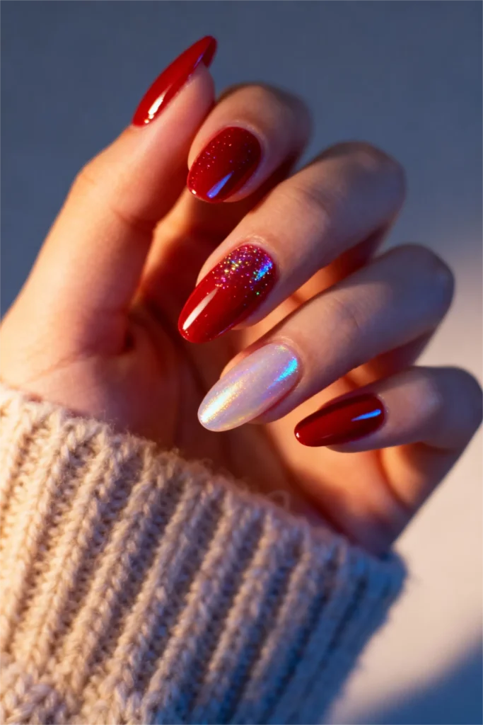 Add dimension and sparkle to your manicure with this gorgeous red glitter accent nail design. The combination of solid red acrylic nails with strategic glitter placement creates visual interest without overwhelming the overall look. One nail features dense glitter coverage while another showcases an iridescent pearl-like finish, demonstrating how mixing textures can elevate a simple color scheme into something extraordinary.