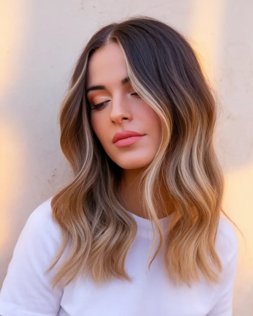 Mid-length hair remains a top choice for autumn 2025, striking the perfect balance between manageability and expressiveness. The style shown features soft, undone waves with expertly blended balayage—deep roots flowing into creamy, golden-blonde tips. This “lived in” approach to color enhances the visual texture, mimicking sunlight flickering through autumn leaves. It flatters every face shape and requires minimal daily styling, making it ideal for anyone leading a busy, on-the-go lifestyle.