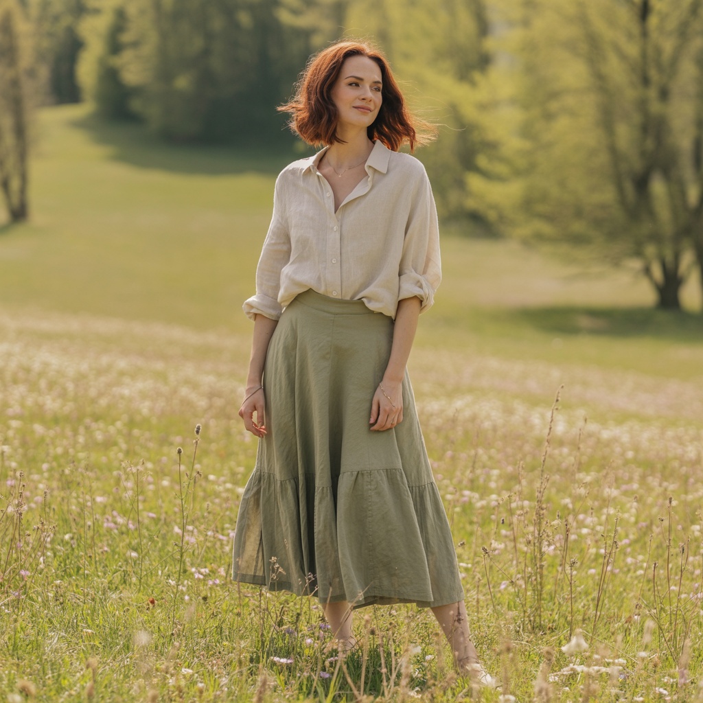 A linen midi skirt with a relaxed button-down shirt creates an effortlessly sophisticated look. Tuck the front of the shirt in loosely and leave the rest untucked for a modern silhouette. Add woven sandals and minimal jewelry.