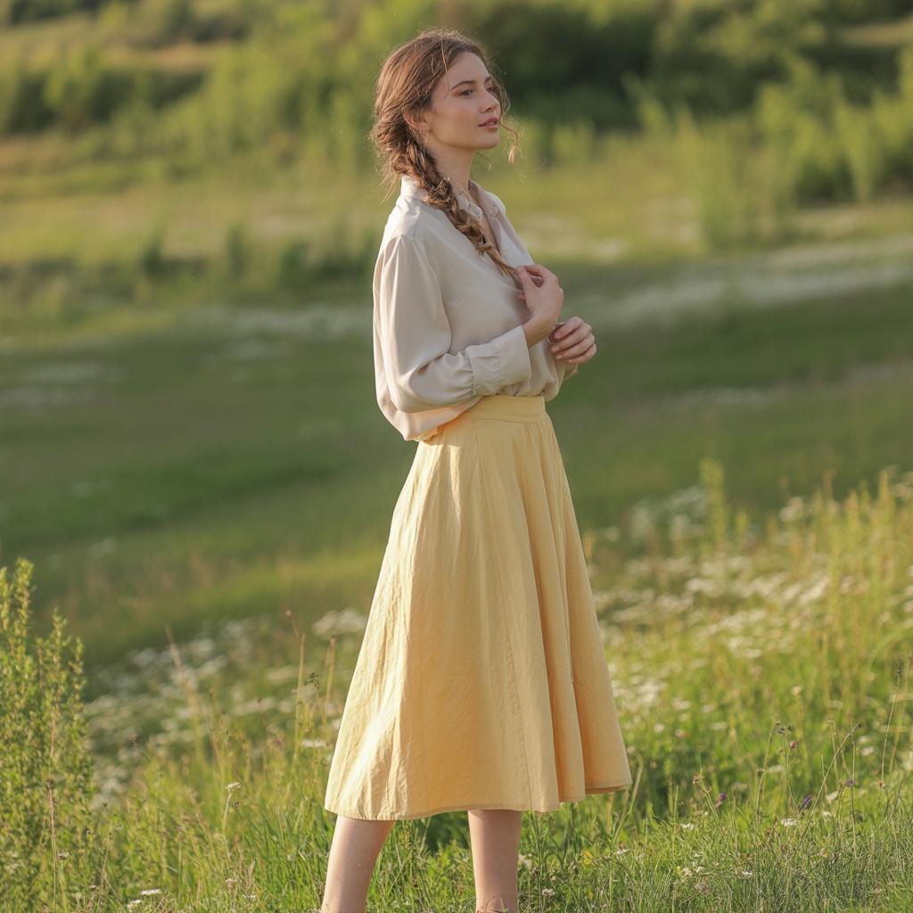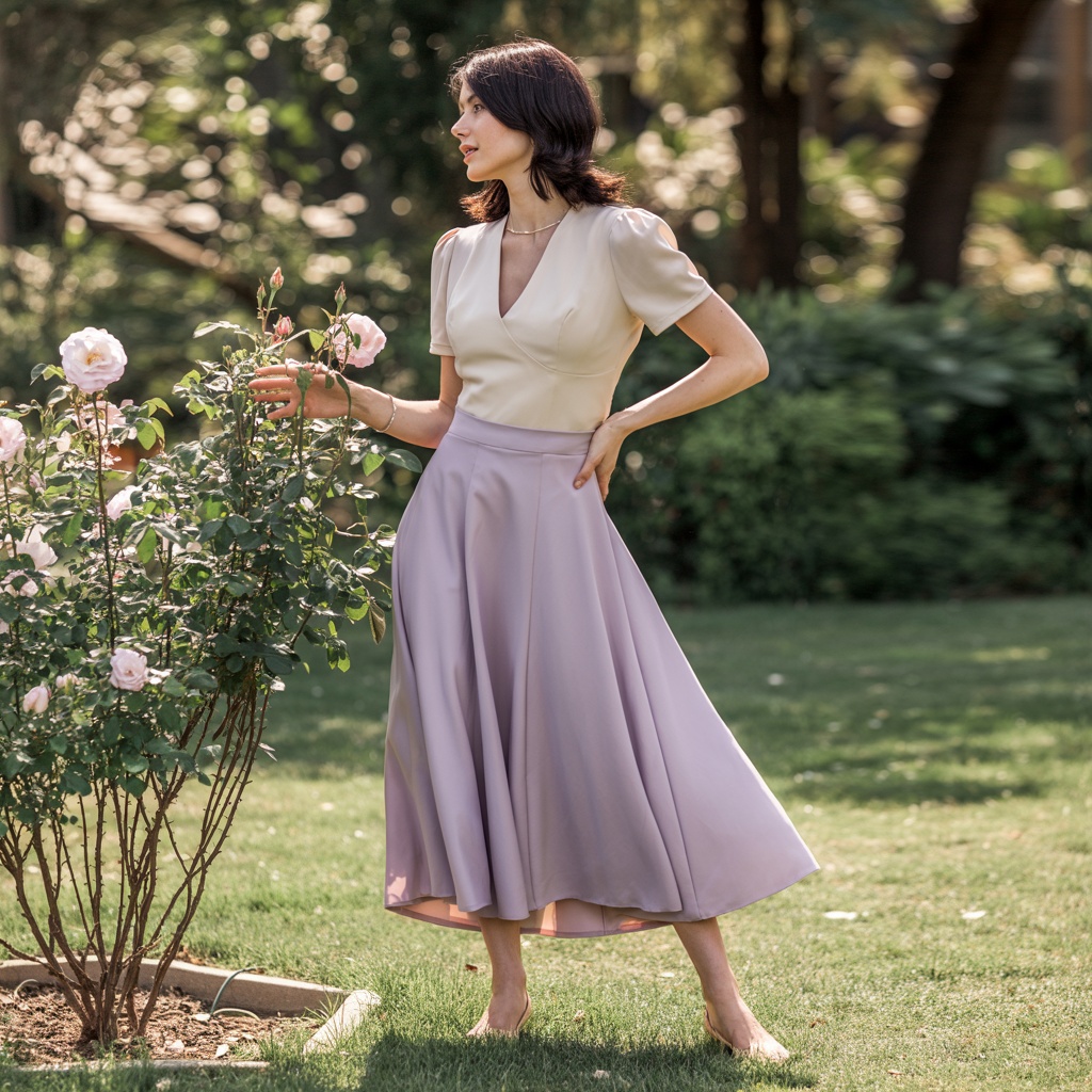 A midi skirt in a rich spring color paired with a feminine blouse creates an elegant combination. Choose a blouse with details like subtle ruffles, a bow neck, or delicate button accents. Add a cropped cardigan or jacket if the venue is air-conditioned.