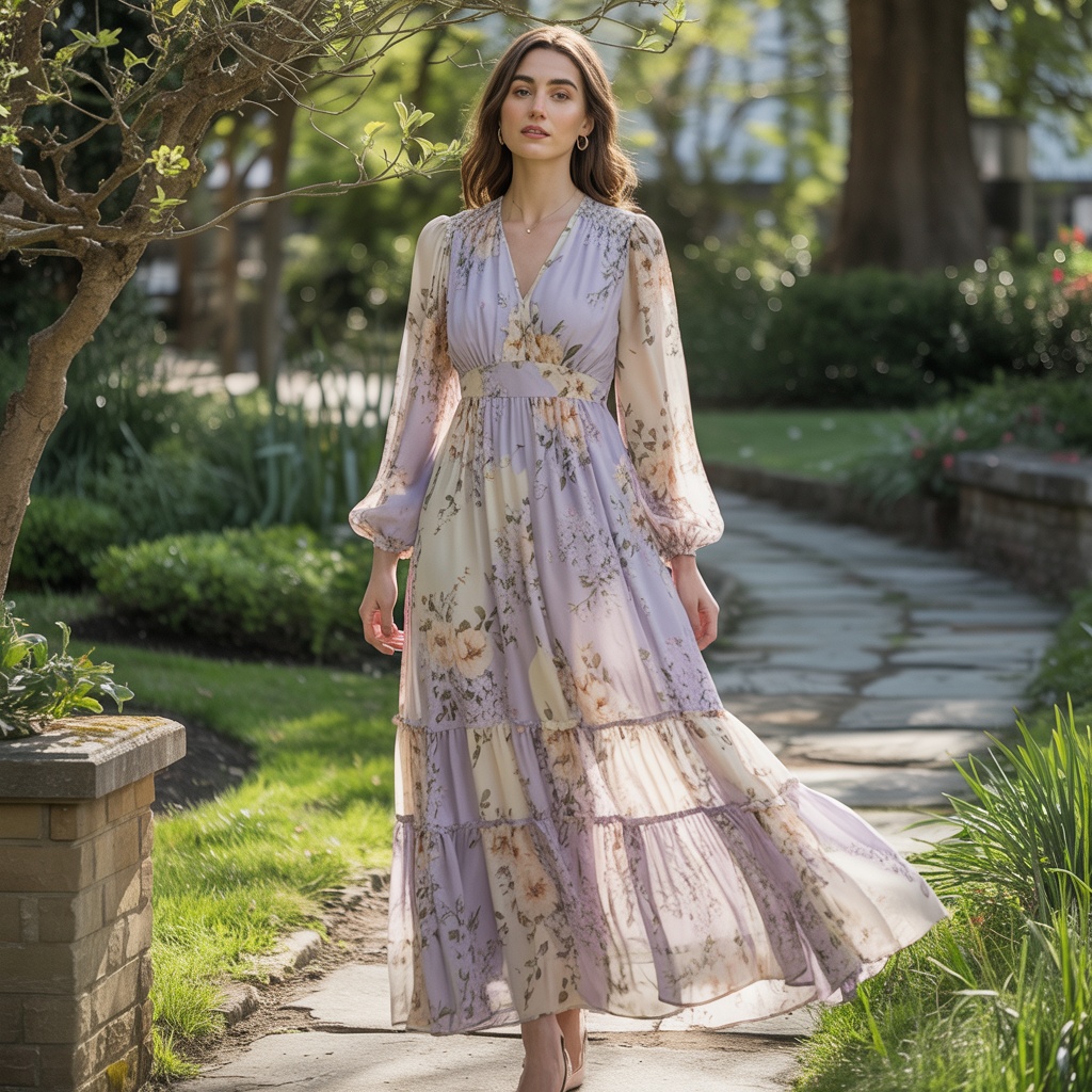 A long-sleeved maxi dress in a soft floral print strikes the perfect balance. Look for styles with defined waists and flowing skirts. Add statement earrings and dress sandals or low heels. A structured bag elevates the look further.