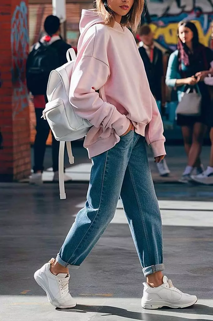 - Normcore 2.0: Baggy jeans, boxy pastel tee, oversized beige shacket, retro sneakers, and a mini backpack.
