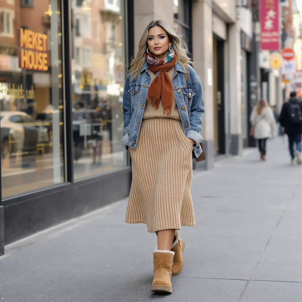 Coffee DateTurtleneck sweaterKnit midi skirtDenim jacketStatement scarf, hoop earringsClassic Chestnut