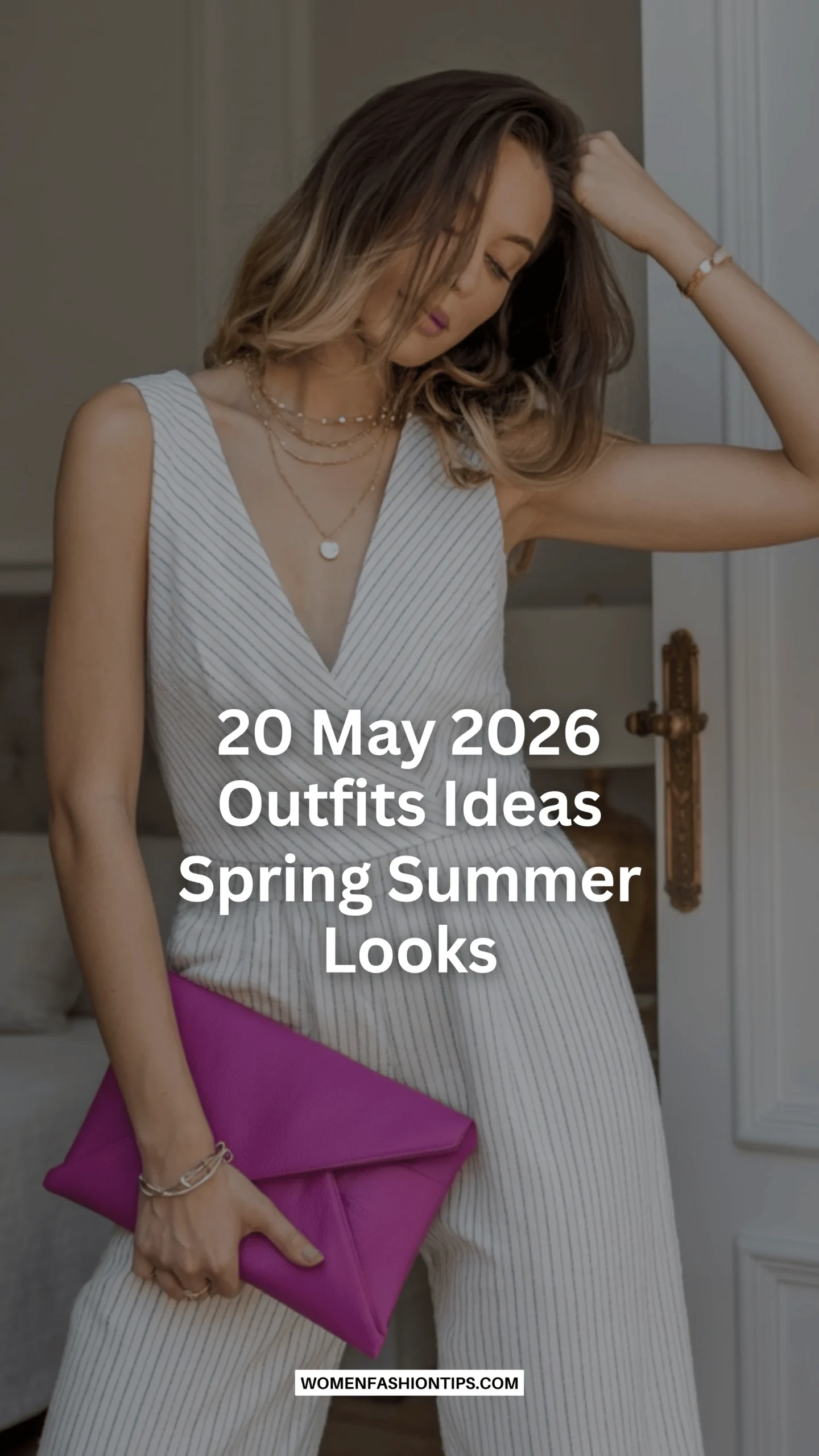 A pinstripe jumpsuit shouldn’t be this sexy, but here we are. The deep V wrap front, the sleeveless cut, the subtle pinstripe in cream and fine gray—it reads professional until you notice how the fabric falls against the body, how the waist cinches without a belt, how the wide legs suggest movement and freedom. Then that magenta envelope clutch arrives like a exclamation of pure joy against all that sophisticated restraint. Layered gold necklaces and bracelets add warmth without weight.