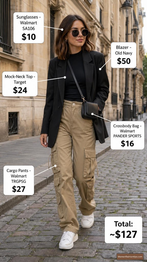 For under $130 total, this look is wildly accessible. The Old Navy black blazer is $50, the Target mock-neck is $24, Walmart TRGPSG cargos are $27, and the entire outfit comes together with a $16 Walmart PANDER SPORTS crossbody and $10 Walmart SA106 sunglasses. Add white platform sneakers and you’re done. Affordable and editorial — my favorite combination.