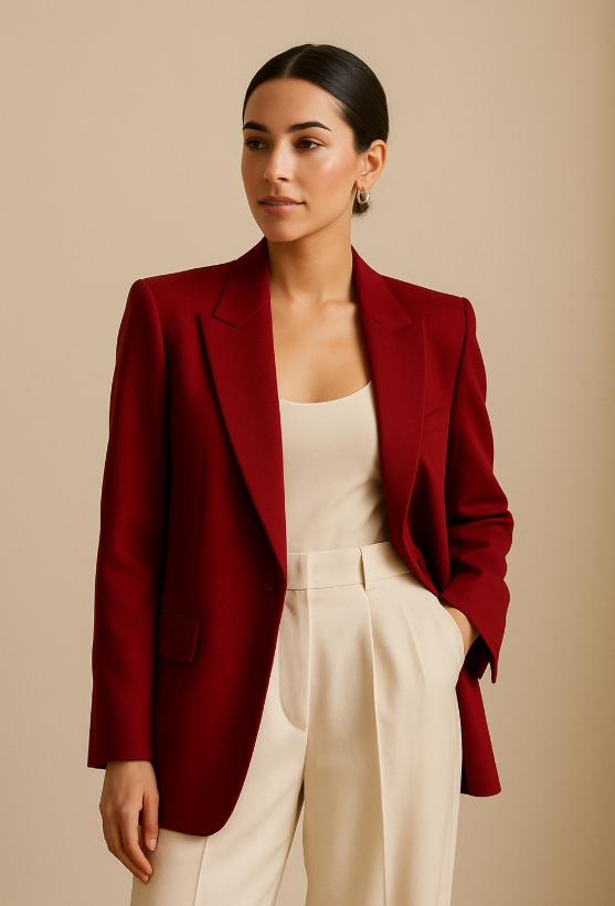 What sets this cherry red look apart is its seamless mix of soft and strong. The clean elegance of cream trousers tempers the blazer’s vibrancy, while the overall silhouette is both current and timeless. This is the new uniform for the working woman: a blend of classic palette and electrifying detail, built for ease, movement, and real life.