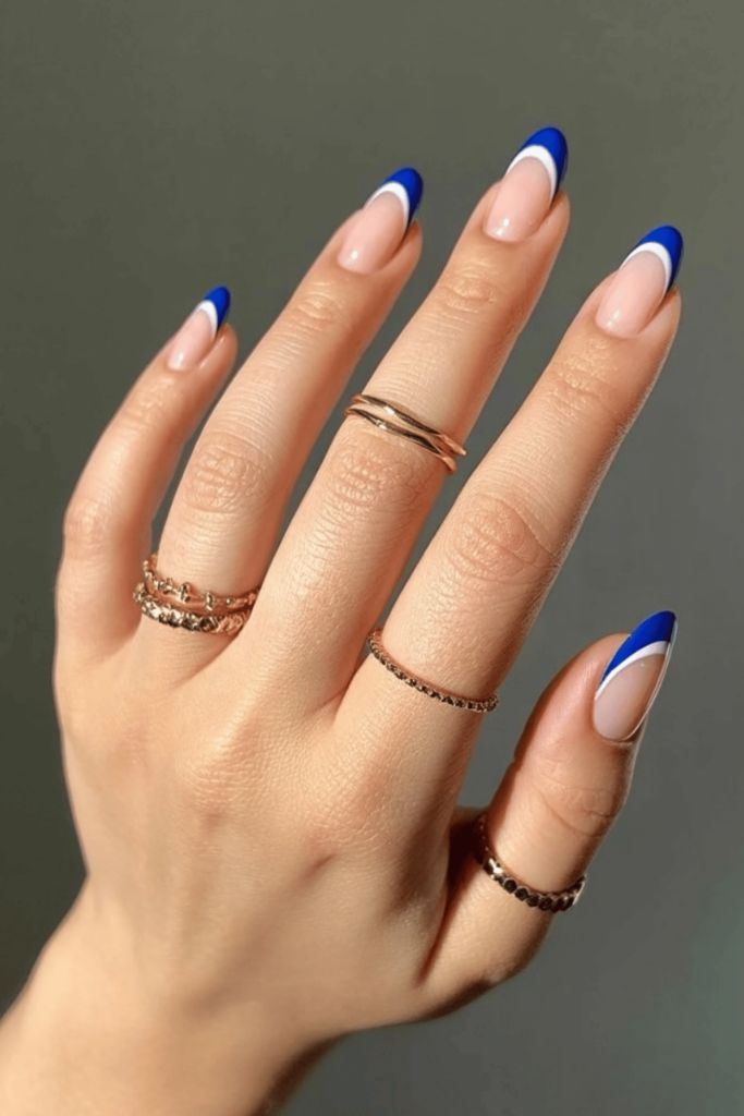 This is the design that made me fall in love with almond french tip nails spring 2026 all over again. The soft almond shape naturally elongates the fingers, and the double French — a thin white line followed by a thicker cobalt band — creates this layered, almost architectural look. It’s like a classic French manicure went to art school and came back more interesting. The nude base keeps everything grounded, and the two-tone tips feel fresh and intentional.