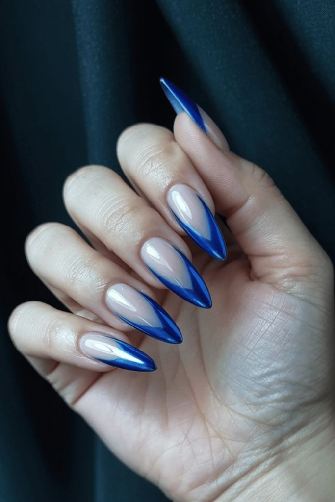 If you’ve ever wanted your nails to look like they were forged from liquid metal, this is the design. The stiletto shape is dramatic on its own, but the V-shaped metallic blue chrome tips take it somewhere completely otherworldly. The nude center of each nail is exposed like a window, while the chrome edges catch and bend light in a way that’s almost hypnotic. This isn’t your everyday spring look, but it’s the kind of nail art that makes you feel powerful.