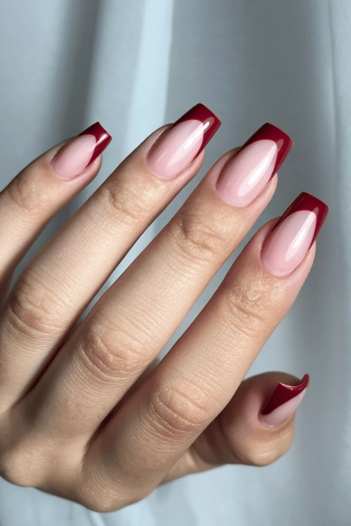 I know red doesn’t always scream “spring,” but hear me out — this deep burgundy-red on square nails with that angular cut is giving late-March energy, when winter’s drama is fading but you’re not quite ready to let go of richness. The tips are sharp and geometric, almost like little chevrons, and the sheer pink base beneath is so glassy and perfect that the whole thing looks like it belongs in a high-end fragrance campaign.