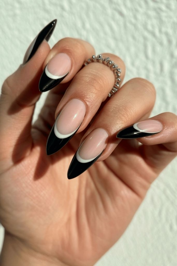Getting that white crescent between the black tip and nude base requires layering. Start with your nude or sheer base, cure or dry, then paint the white arc using a thin liner brush. Once that’s set, apply the black tip over the top portion. Beetles Gel Polish in “Jet Black” offers an incredibly opaque, one-coat black that won’t look streaky. The stiletto shape is best achieved with builder gel or acrylic if your natural nails don’t grow to that length.