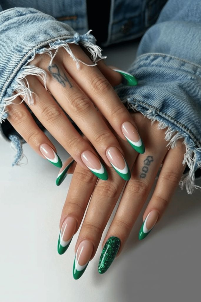 If you love color but want something more refined than neon, this emerald double French is the sweet spot. It’s festive without being loud, and the almond shape keeps everything sophisticated.