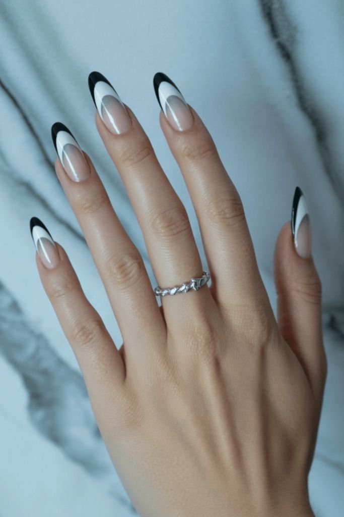 There’s a graphic quality to this black-and-white diagonal French that reminds me of modern architecture — all clean angles and confident lines. The almond shape softens what could otherwise be a very stark design, while the black-and-white diagonal stripes at each tip create a sense of movement that’s almost kinetic. Over a sheer nude base, these tips look like tiny works of abstract art. It’s minimalist french tip nails taken to an editorial extreme.